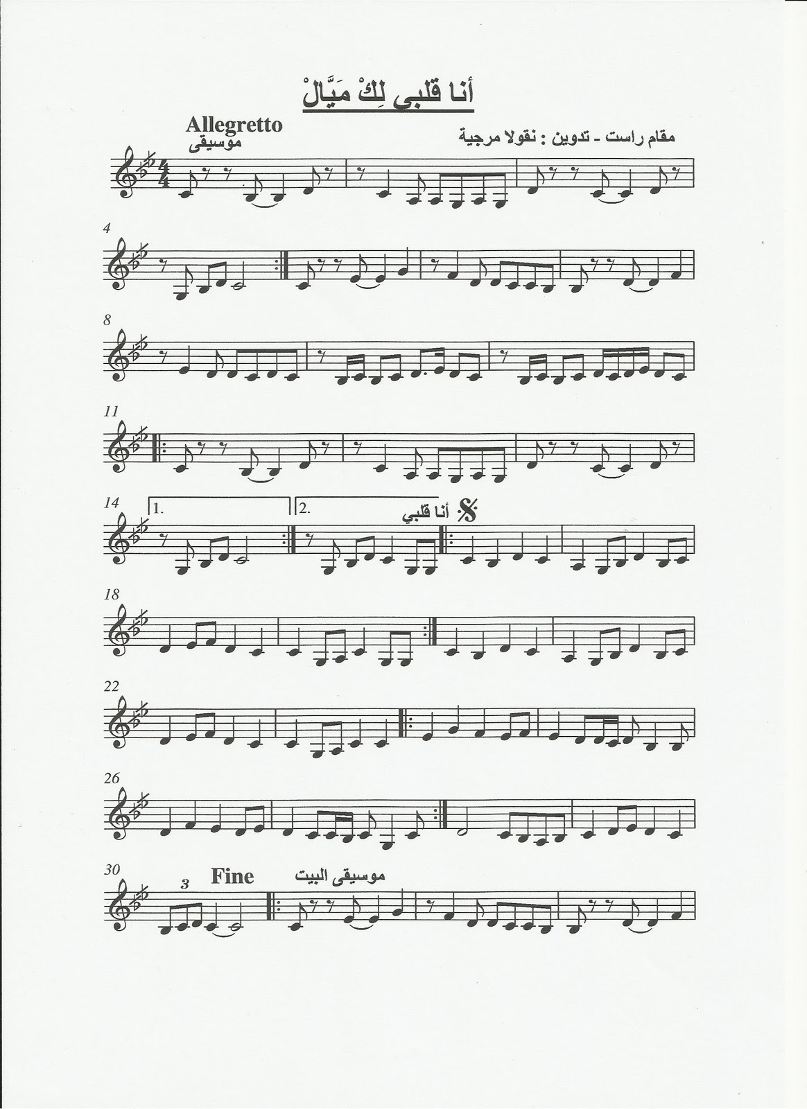 نوتات موسيقية أنا قلبي ليك ميال من ألحان محمد الموجي مي Facebook