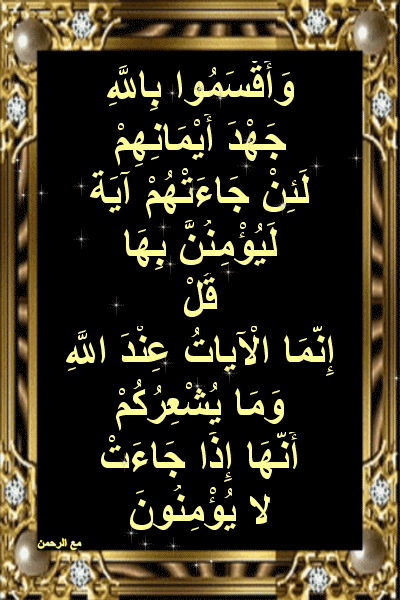 و أ ق س م وا ب الل ه ج ه د أ ي م ان ه م ل ئ ن ج اء ت ه م آي ة ل ي ؤ م ن ن ب ه ا ق ل إ ن م ا ال آي ات ع ند الل ه و م ا ي ش ع ر ك م أ ن ه ا إ ذ ا ج اء ت ل ا ي ؤ م ن ون 109 القول في تأويل.