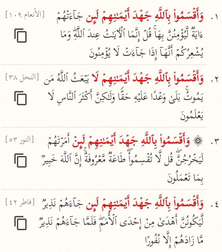 وأقسموا بالله جهد أيمانهم. وأقسموا بالله جهد إيمانهم غايتها لئن أمرتهم بالجهاد ليخرجن قل لهم لا تقسموا طاعة معروفة للنبي خير من قسمكم الذي لا تصدقون فيه إن الله خبير بما تعلمون من طاعتكم بالقول ومخالفتكم بالفعل. و أ ق س م وا ب الل ه ج ه د أ ي م ان ه م ل ئ ن ج اء ه م ن ذ ير ل ي ك ون ن أ ه د ى م ن إ ح د ى ال أ م م ف ل م ا ج اء ه م ن ذ ير م ا ز اد ه م إ ل ا ن ف ور ا 42 القول في تأويل قوله تعالى. و أ ق س م وا ب الل ه ج ه د أ ي م ان ه م ل ئ ن أ م ر ت ه م ل ي خ ر ج ن ق ل ل ا ت ق س م وا ط اع ة م ع ر وف ة إ ن الل ه خ ب ير ب م ا ت ع م ل ون 53 يقول تعالى مخبرا عن أهل النفاق الذين. و أ ق س م وا ب الل ه ج ه د أ ي م ان ه م ل ئ ن أ م ر ت ه م ل ي خ ر ج ن ق ل ل ا ت ق س م وا ط اع ة م ع ر وف ة إ ن الل ه خ ب ير ب م ا ت ع م ل ون ق ل.