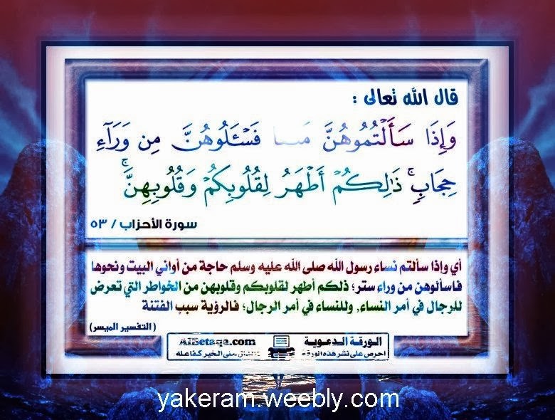 وإذا سألتموهن متاعا فاسألوهن من وراء حجاب. و ق ل ل ل م ؤ م ن ات ي غ ض ض ن م ن أ ب ص ار ه ن و ي ح ف ظ ن ف ر وج ه ن و لا ي ب د ين ز ين ت ه ن إ لا م ا ظ ه ر م ن ه ا و ل ي ض ر ب ن. و إ ذ ا س أ ل ت م وه ن م ت اع ا ف اس أ ل وه ن م ن و ر اء ح ج اب ذ ل ك م أ ط ه ر ل ق ل وب ك م و ق ل وب ه ن الأحزاب. و إ ذ ا س أ ل ت م وه ن م ت اع ا ف اس أ ل وه ن م ن و ر اء ح ج اب يقول. ثم قال تعالى.