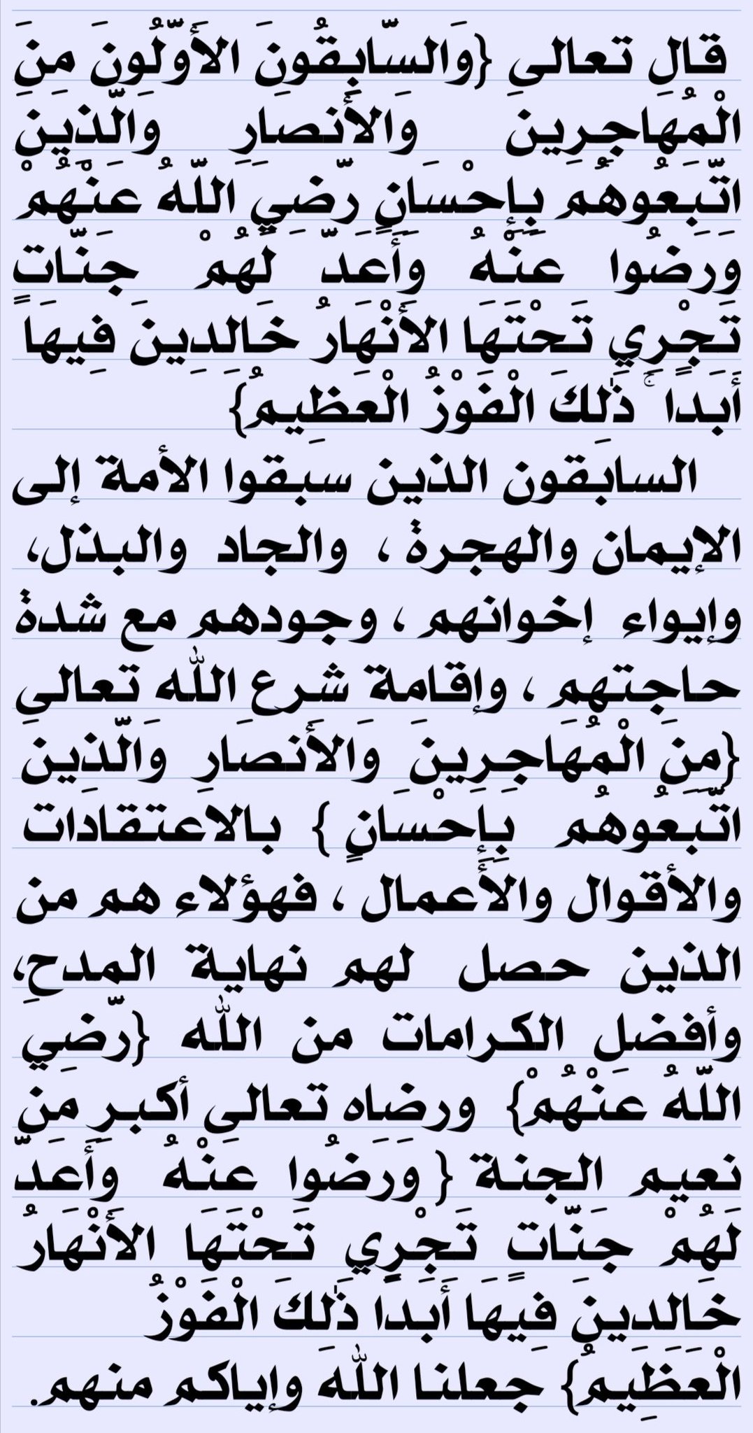 والسابقون الأولون من المهاجرين والأنصار تفسير ابن كثير. و الس اب ق ون الأو ل ون م ن ال م ه اج ر ين و الأن ص ار الآية 100 إلى قوله تعالى. وفي عقيدة الإمام أحمد أنه كان يقول. شرح كتاب المصباح المنير في تهذيب تفسير ابن كثير سورة التوبة 18 من قوله تعالى. والسابقون الأولون من المهاجرين والأنصار والذين اتبعوهم بإحسان رضي الله عنهم ورضوا عنه وأعد لهم جنات تجري تحتها الأنهار خالدين فيها أبدا ذلك الفوز العظيم 100 والسابقون الأولون من المهاجرين والأنصار الآية قرأ يعقوب.