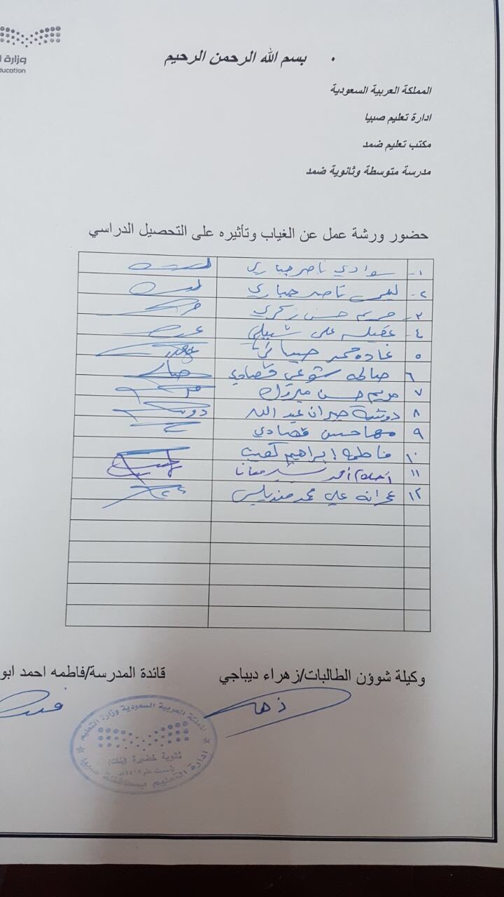 ورشة عمل عن الغياب. وطبعا لازم تطبعين الورش وتوزعينها عالحضور وتناقشون بالاسئلة. بسم الله الرحمن الرحيم كل ماتحتاجه وبملف واحد عن إجراءات الحد من غياب الطلاب وأتشر ف بنقل كل جهودي الخاصة ليستفيد منها الآخرين وإن قصر ت بشئ فأنتم تكملونه. يجب توجيه المدرسين وأولياء الأمور إلى ضرورة التعامل مع الطفل في كل ما يخص الدراسة والمدرسة بنوع من الهدوء والرفق. المناسبة لظاهرة الغياب وفي الختام تم تسليم المرشدة الطلابية شهادة شكر من قبل قائدة المدرسة رجاء شرواني.