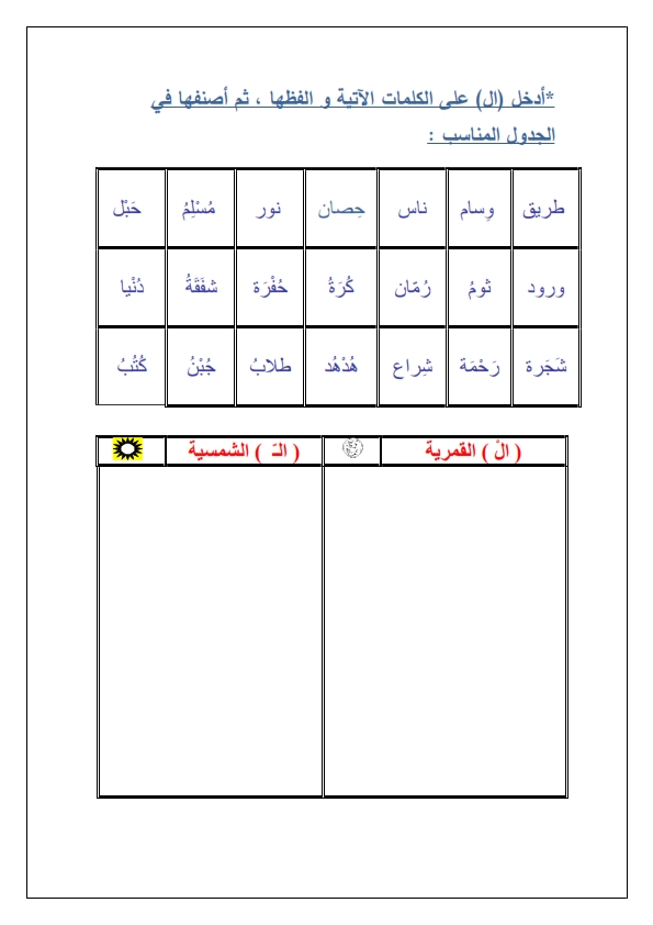 اللام الشمسية والقمرية اللغة العربية اوراق عمل