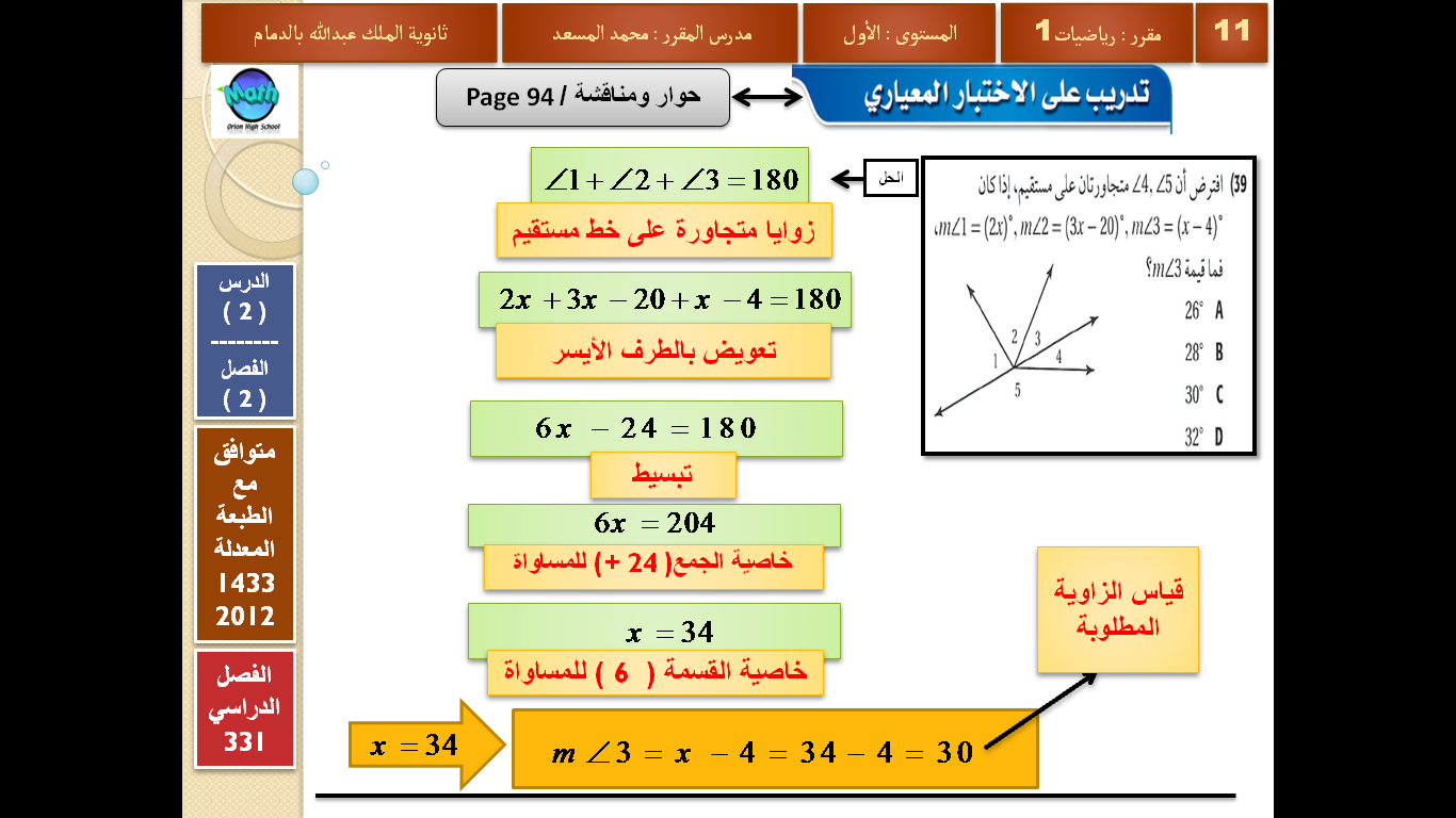 رياضيات الصف الأول الثانوي الفصل الدراسي الأول الزوايا والمستقيمات المتوازية