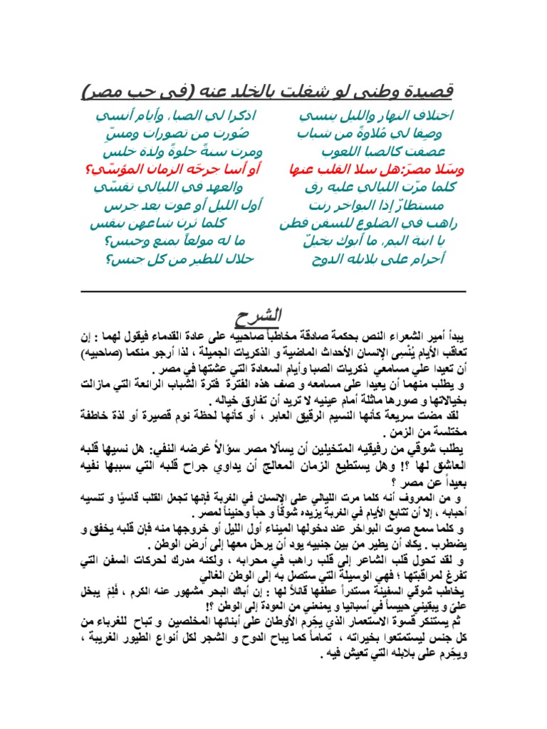 امير الشعراء احمد شوقي قصيدة وطني لو شغلت بالخلد عنه نازعتني إليه في الخلد نفسي