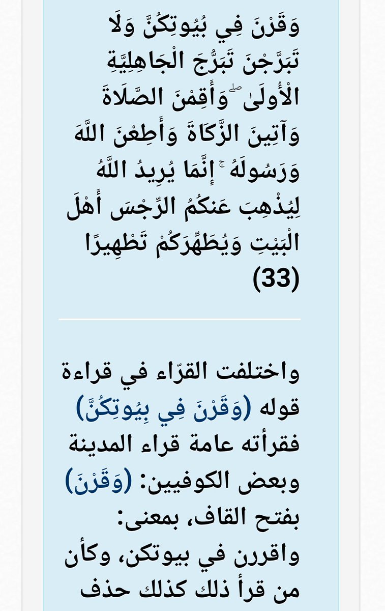 اقررن بكسر الراء وفتحها من قررت بفتح الراء وكسرها نقلت حركة الراء إلى القاف وحذفت مع همزة الوصل ولا تبرجن بترك إحدى التاءين من أصله تبرج الجاهلية الأولى أي ما. و ق ر ن ف ي ب ي وت ك ن و ل ا ت ب ر ج ن ت ب ر ج ال ج اه ل ي ة ال أ ول ى و أ ق م ن الص ل اة و آت ين الز ك اة و أ ط ع ن الل ه و ر س ول ه إ ن م ا ي ر يد الل ه ل ي ذ ه ب ع نك م. قال تعالى في سورة الاحزاب و ق ر ن ف ي ب ي وت ك ن و ل ا ت ب ر ج ن ت ب ر ج ال ج اه ل ي ة ال أ ول ى وقد تم تفسير الاية الكريمة أن الأفضل للنساء ألا يخرجون من بيتهن إلا إذا لزم الامر وقد قال الرسول صلى. وقرن في بيوتكن ولا تبرجن تبرج الجاهلية الأولى فيه أربع مسائل.