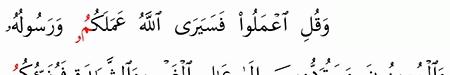 و ق ل اع م ل وا ف س ي ر ى الل ه ع م ل ك م و ر س ول ه و ال م ؤ م ن ون و س ت ر د ون إ ل ى ع ال م ال غ ي ب و الش ه اد ة ف ي ن ب ئ ك م ب م ا ك ن ت م ت ع م ل ون التوبة 105