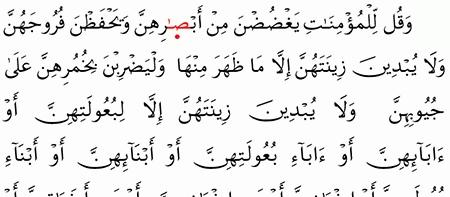 و ق ل ل ل م ؤ م ن ات ي غ ض ض ن م ن أ ب ص ار ه ن و ي ح ف ظ ن ف ر وج ه ن و لا ي ب د ين ز. ق ل ل ل م ؤ م ن ين ي غ ض وا م ن أ ب ص ار ه م و ي ح ف ظ وا ف ر وج ه م و ق ل ل ل م ؤ م ن ات ي غ ض ض ن. وقل للمؤمنات يغضضن من أبصارهن عما لا يحل ويحفظن فروجهن عمن لا يحل. عما حرم الله عليهن من النظر إلى غير أزواجهن.