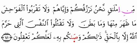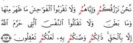 ق ل ت ع ال و ا أ ت ل م ا ح ر م ر ب ك م ع ل ي ك م أ ل ا ت ش ر ك وا ب ه ش ي ئ ا و ب ال و ال د ي ن إ ح س ان ا و ل ا ت ق ت ل وا أ و ل اد ك م م ن إ م ل اق ن ح ن ن ر ز ق ك م و إ ي اه م و ل ا ت ق ر ب وا ال ف و اح ش م ا ظ ه ر م ن ه ا و م ا