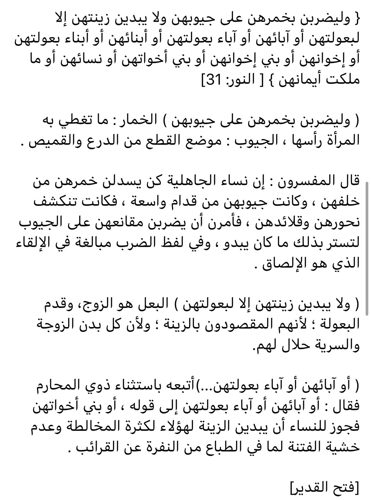 وليلقين خ م رهن وهي جمع خمار على جيوبهن ليسترن بذلك شعورهن وأعناقهن وق ر ط ه ن. قال الله تعالى. والله تعالى أعلم. ي نكر البعض فرضية الحجاب غطاء الرأس لتفسيرهم الخاطئ لقول الله تعالى.