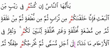 ي اأ ي ه ا الن اس إ ن ك ن ت م ف ي ر ي ب م ن ال ب ع ث ف إ ن ا خ ل ق ن اك م م ن ت ر اب ث م م ن ن ط ف ة ث م م ن ع ل ق ة ث م م ن م ض غ ة م خ ل ق ة و غ ي ر.